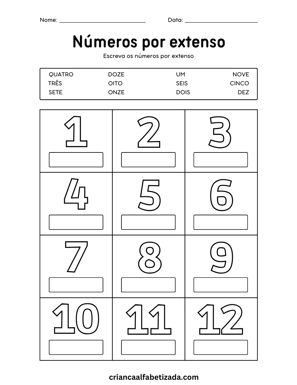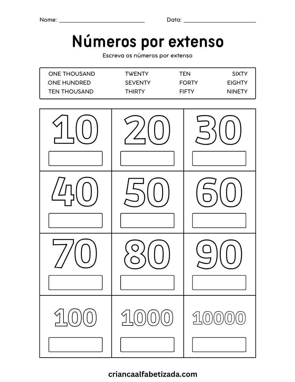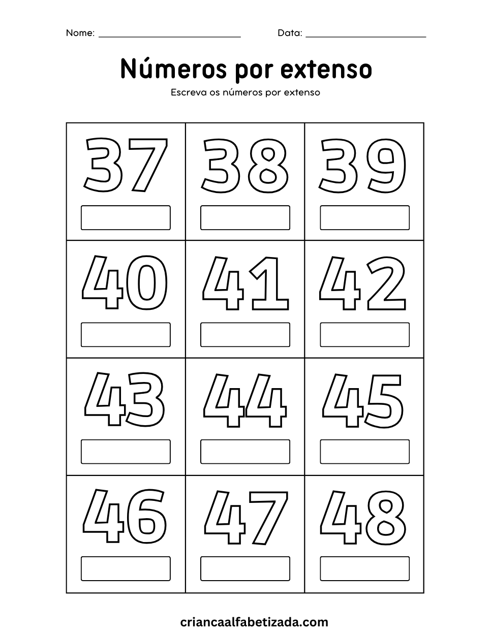 Aqui neste post, pode baixar 8x atividades de matemática sobre números por extenso. Diferente que algarismo, número por extenso são números escritos por inteiro, em palavras. Muitos alunos têm dificuldade entender e escrever números por extenso. Então, baixe estas atividades e pratique. São números de 1 a 10000 (dez mil), os números mais comumente usados. Baixar em formato de PNG ou PDF.