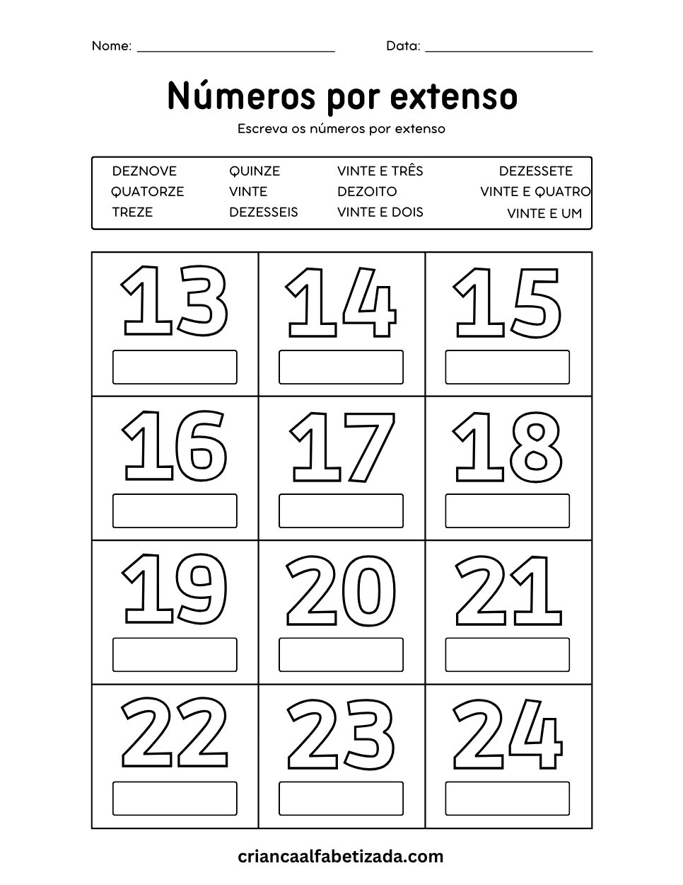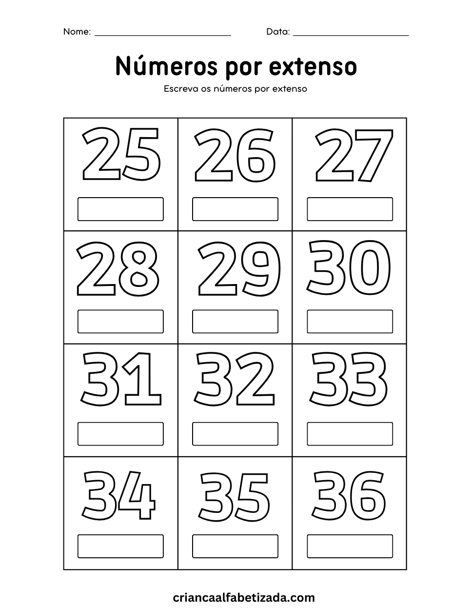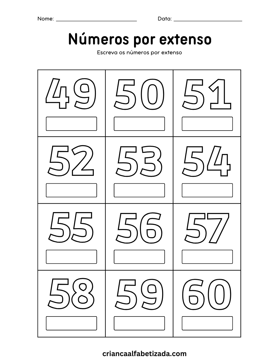 Aqui neste post, pode baixar 8x atividades de matemática sobre números por extenso. Diferente que algarismo, número por extenso são números escritos por inteiro, em palavras. Muitos alunos têm dificuldade entender e escrever números por extenso. Então, baixe estas atividades e pratique. São números de 1 a 10000 (dez mil), os números mais comumente usados. Baixar em formato de PNG ou PDF.