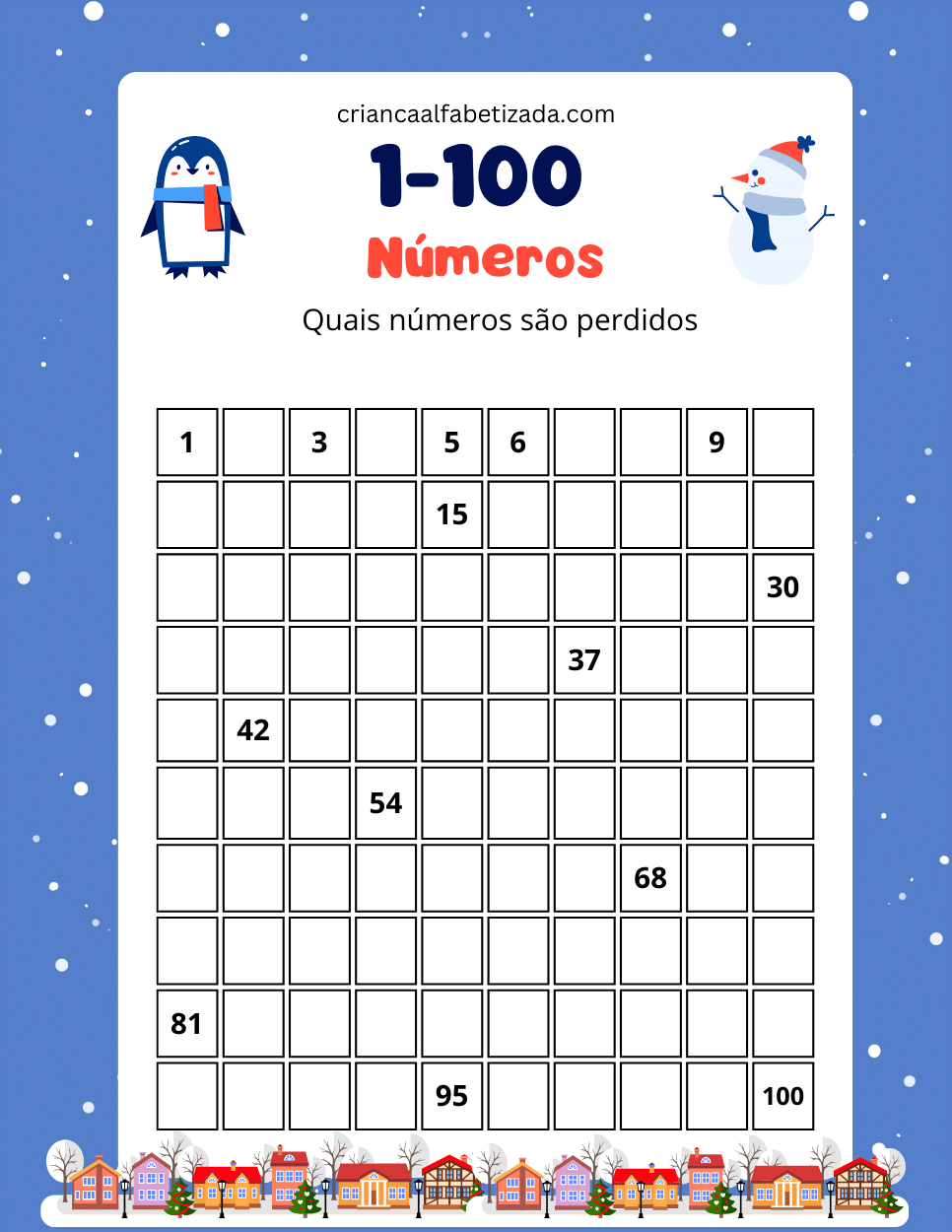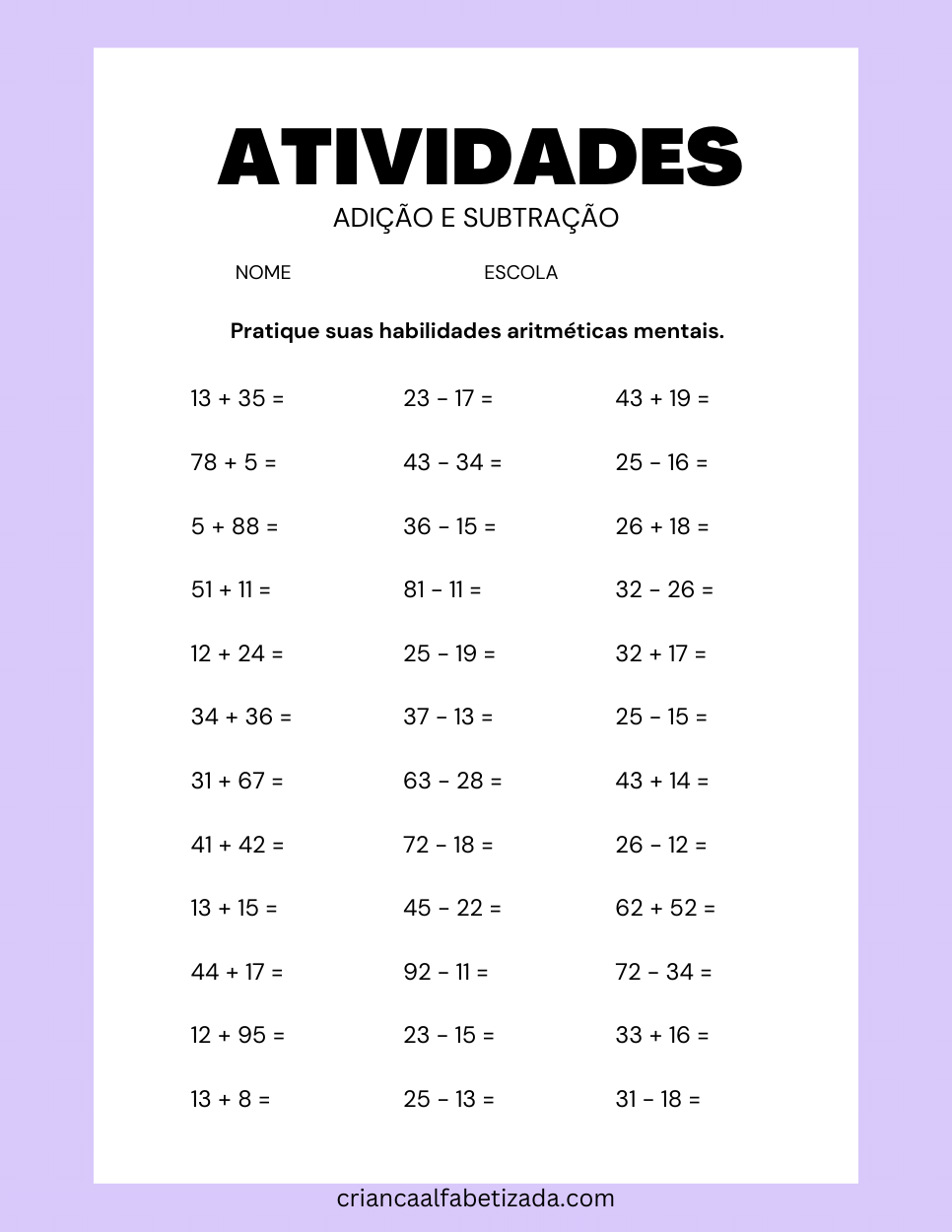 Todas as imagens são em alta-resolução, baixar as atividades que gosta. Ou no final do post, tem um link para baixar todas as páginas de atividades em formato PDF, imprimir e pratique. São atividades sobre: números de 1 a 100, escrever, comparar qual é maior número, contar e escrever os números perdidos entre 1 a 100, além de 4 atividades com adição e subtração abaixo de 100.