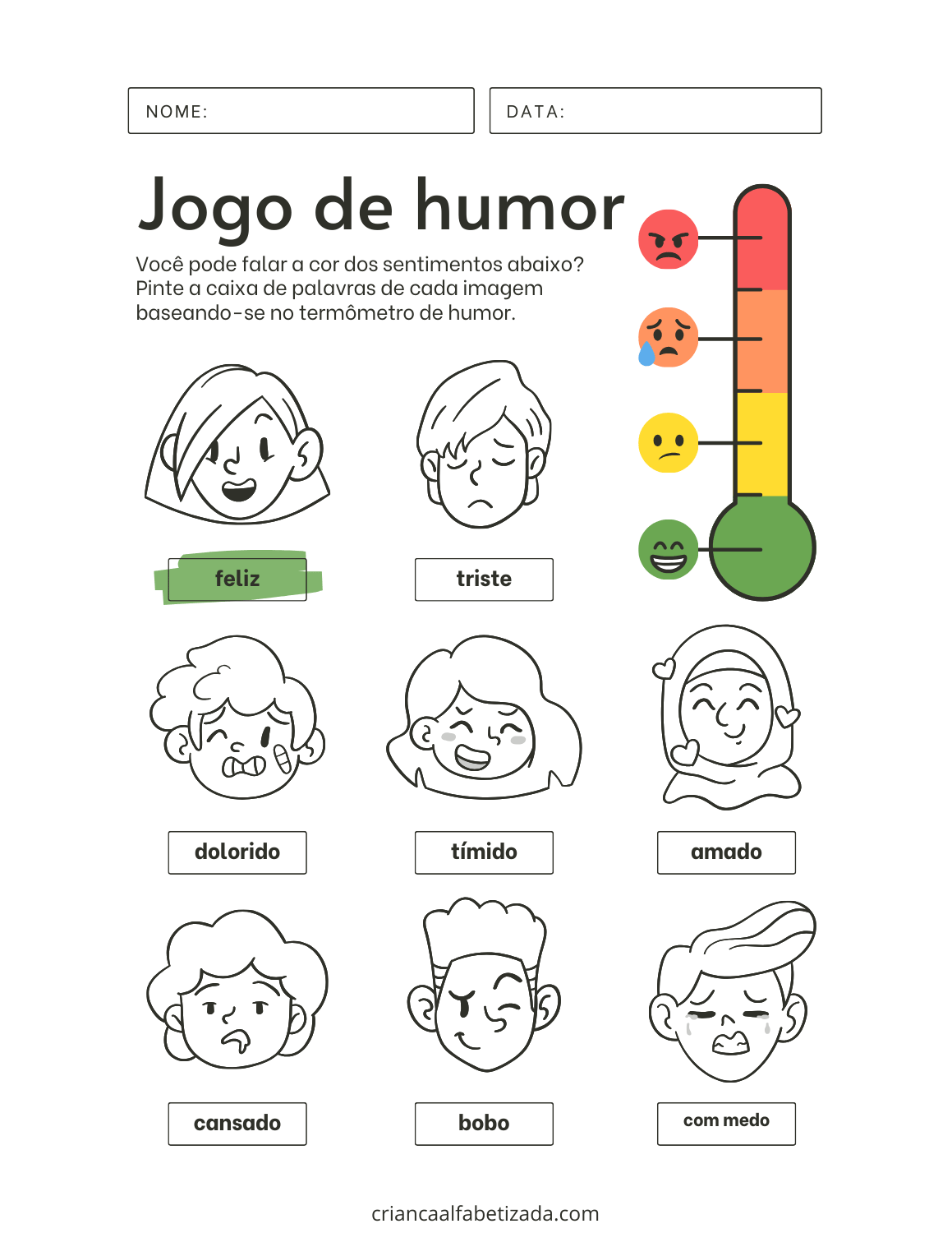 Você pode falar a cor dos sentimentos na imagem? Pinte a caixa de palavras de cada imagem baseando-se no termômetro de humor. Essa atividade é ideal para crianças e educação infantil. Pode baixar e imprimir.