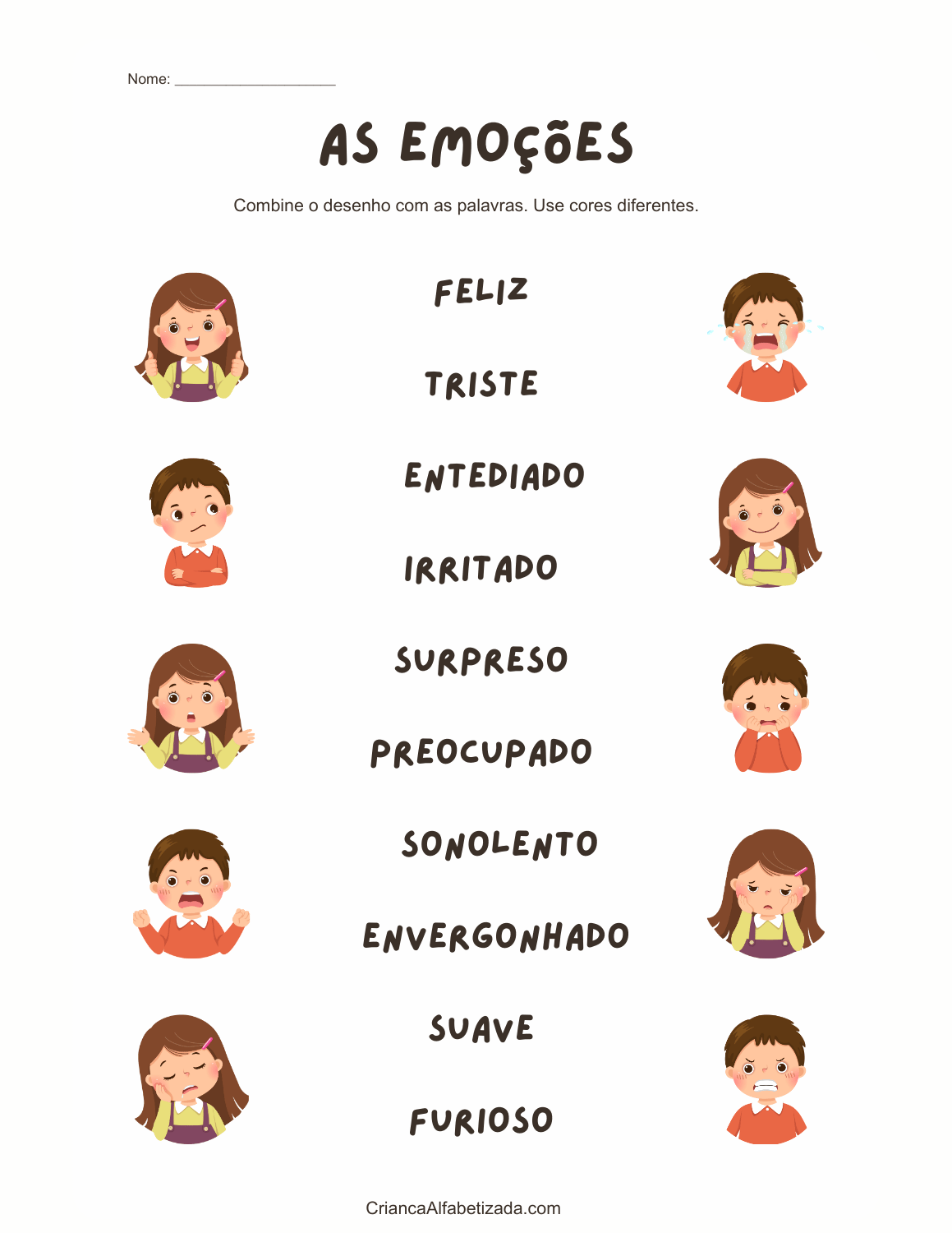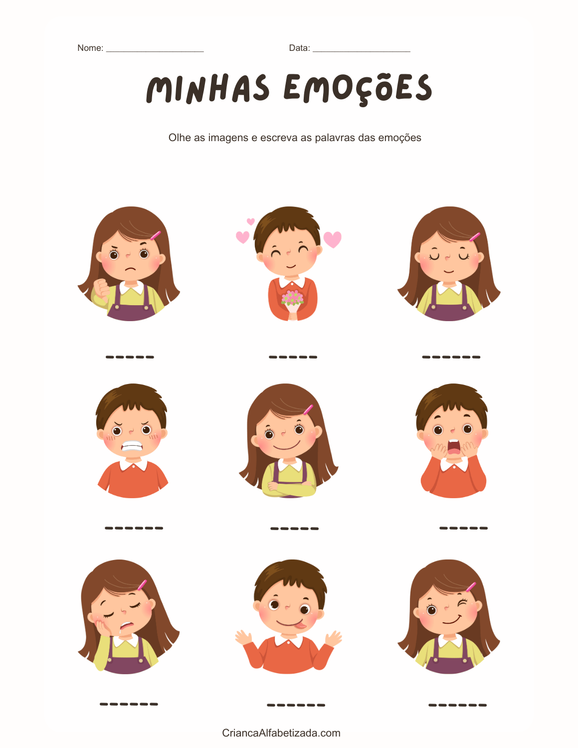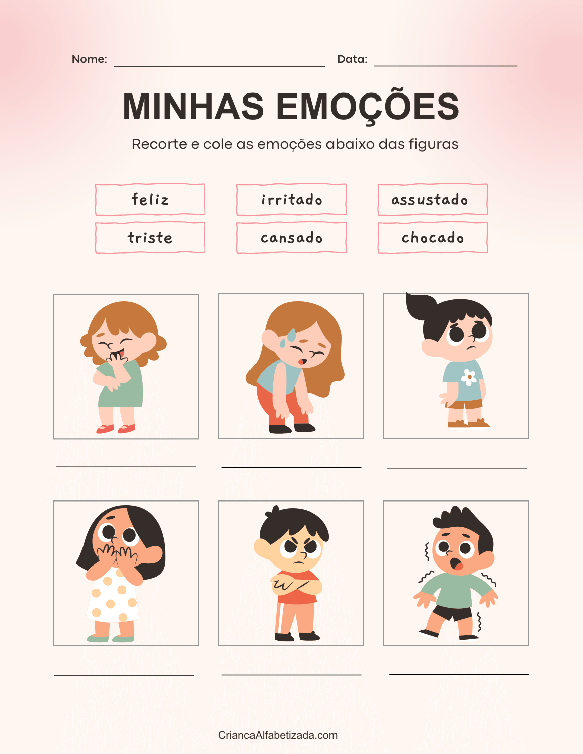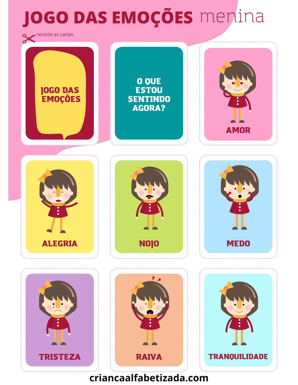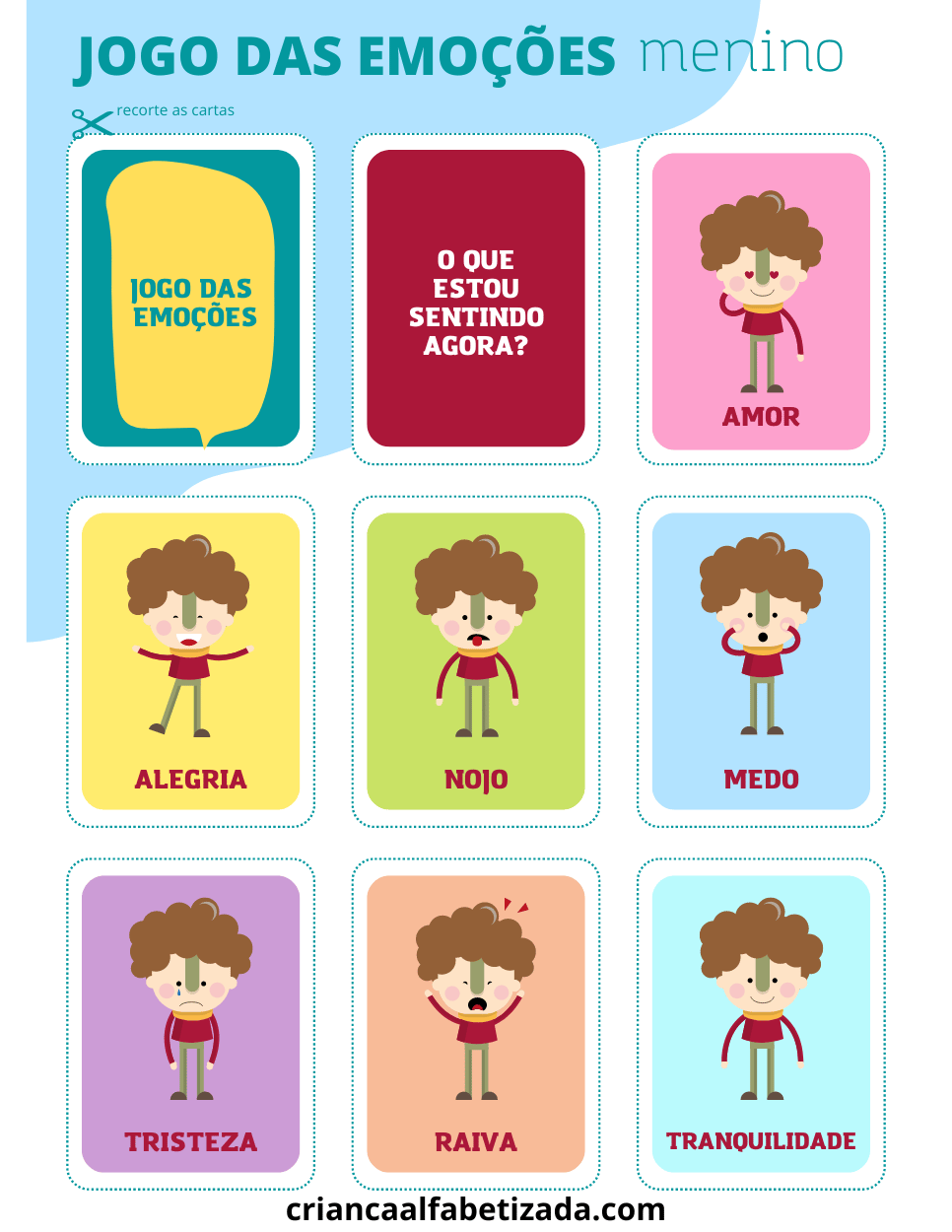 Baixar as duas imagens e recorte as cartas (flashcard). São 7 cartas de diferentes emoções para meninos e 7 cartas para meninas. Vai aprender as emoções como amor, alegria, nojo, medo, tristeza, raiva e tranquilidade.