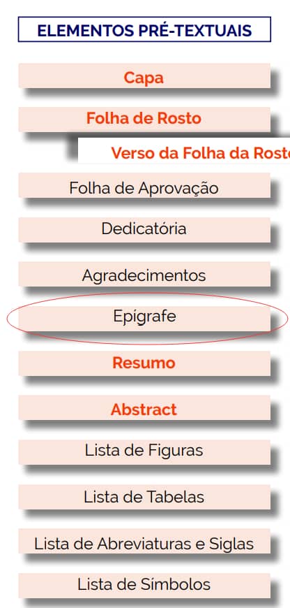 A epígrafe é um elemento textual que geralmente é escrito em verso ou prosa. Geralmente, os autores do trabalho acadêmico a escrevem para fazer uma introdução à pesquisa, ou seja, para apresentar e/ou antecipar o conteúdo que será tratado ao longo do referencial teórico,. Desse modo, são escritas citações ou frases que correspondem ao tema do trabalho.