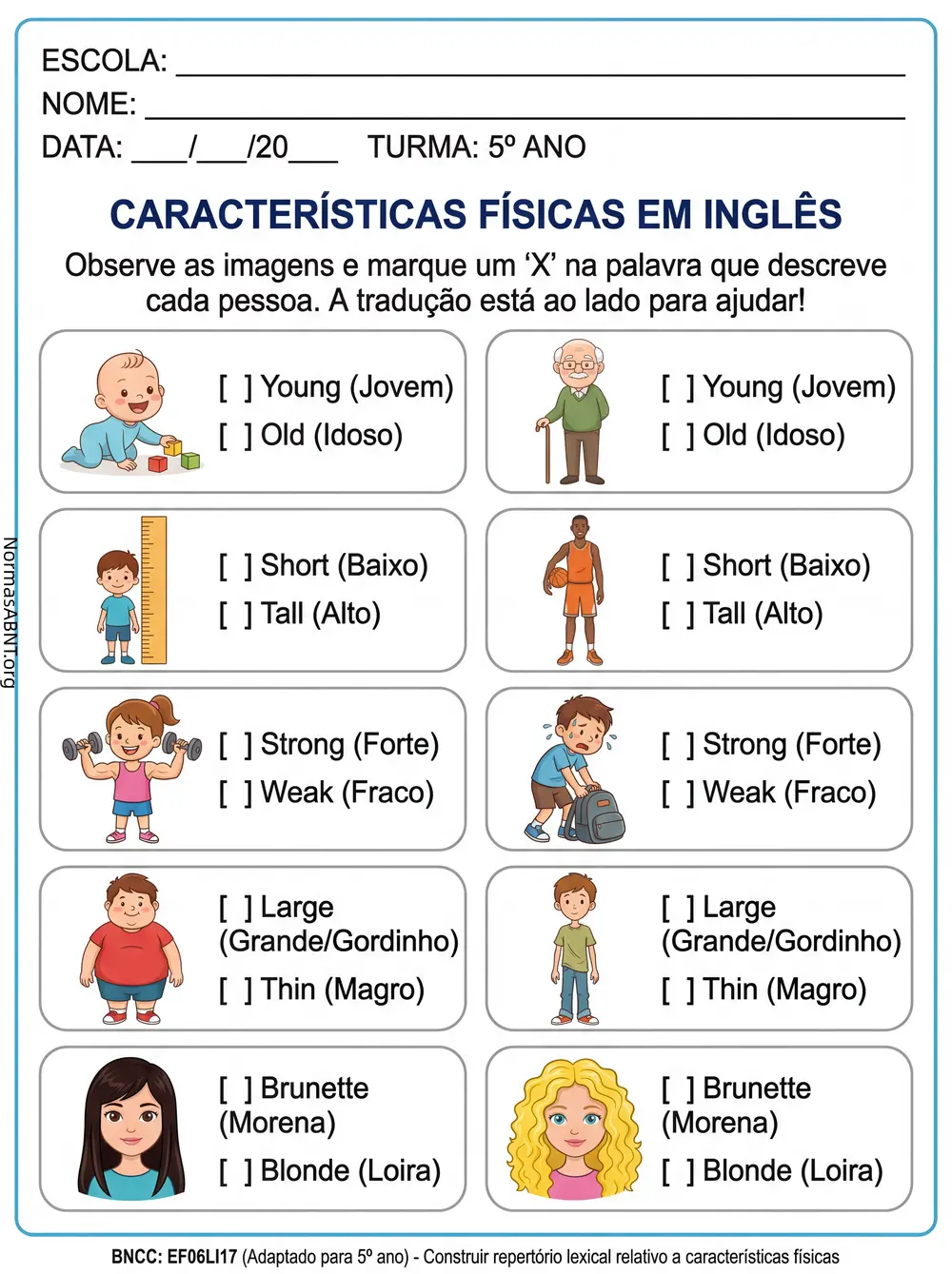 Atividade inglês para 5-6 ano EF: Características físicas em inglês, observa as imagens e marque X na palavras que descreve cada pessoa. A tradução está ao lado para ajudar.