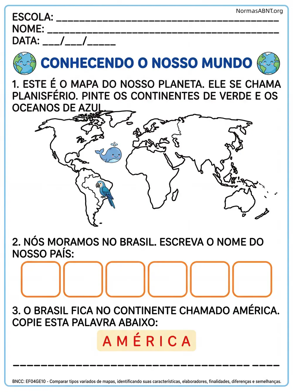 Atividade de geografia de 4º do EF, conhecer o nosso mundo, baixar e imprimir para fazer esse exercício: Este é o mapa do nosso planeta, e onde fica o brasil.