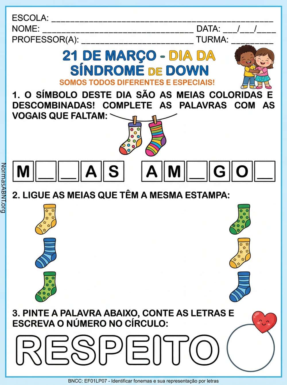 Uma folha de atividade para 21 de março, dia da síndrome de down. Somos todos diferentes e especiais.