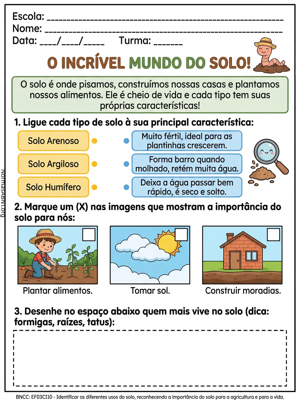 Uma folha de atividade criada segundo bncc EF03CI10, tema ciências, uso de solo, ciência no Epara 3º ano do Ensino fundamental, baixar grátis.