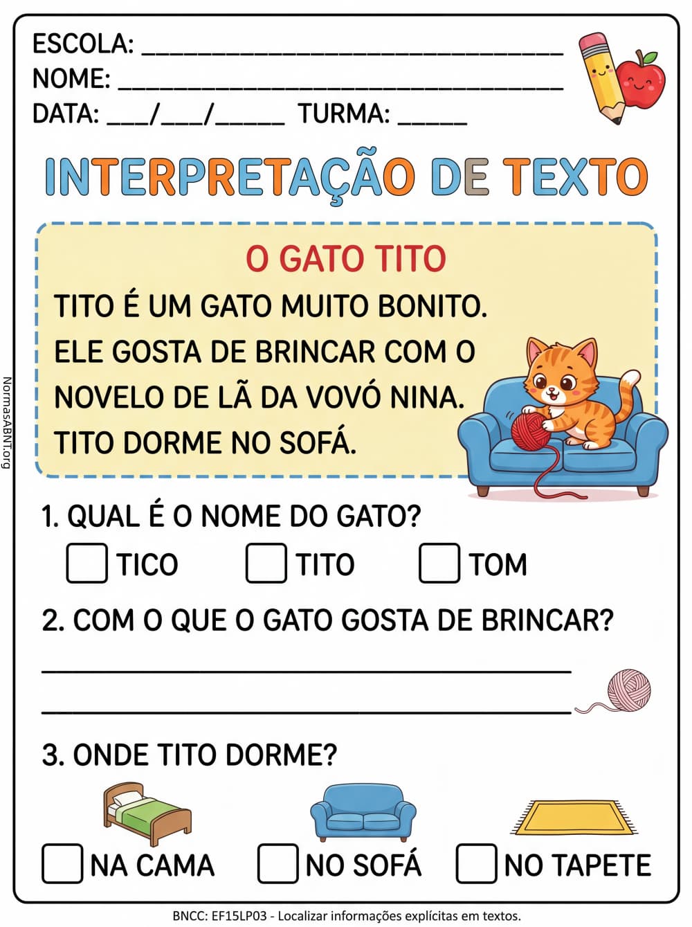 Atividade sobre Interpretação de Texto, alinhada a BNCC EF15LP03. Para alunos do 1º ano do Ensino Fundamental. Matéria: Língua portuguesa. Baixar esta atividade e imprimir em A4 para fazer.