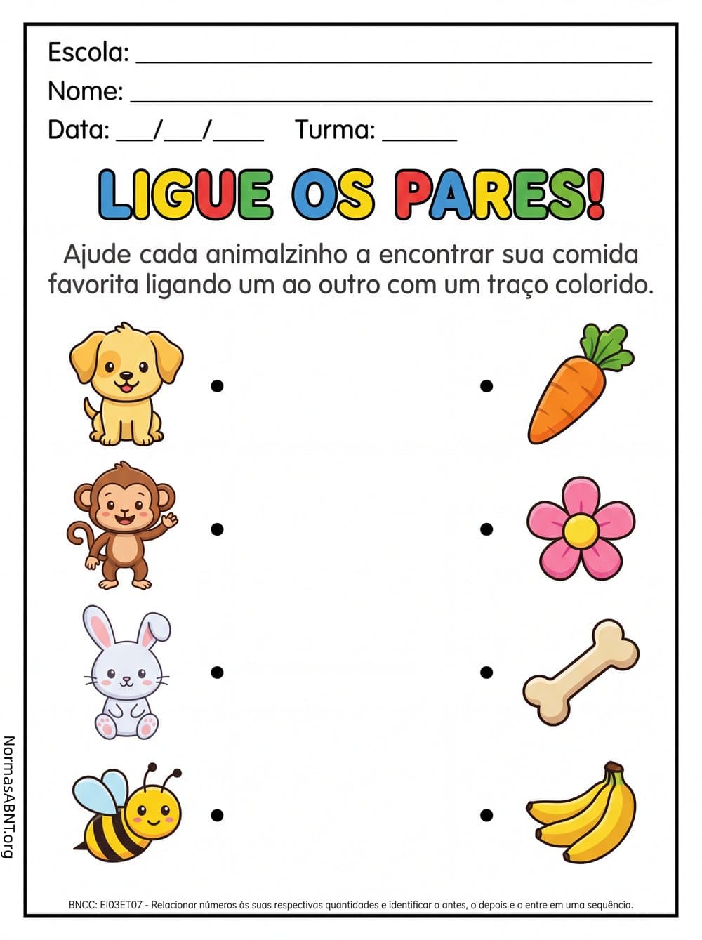 Baixar esta atividade para educação infantil, as crianças podem ajudar cada animal encontrar sua comida favorita com um traço colorido.
