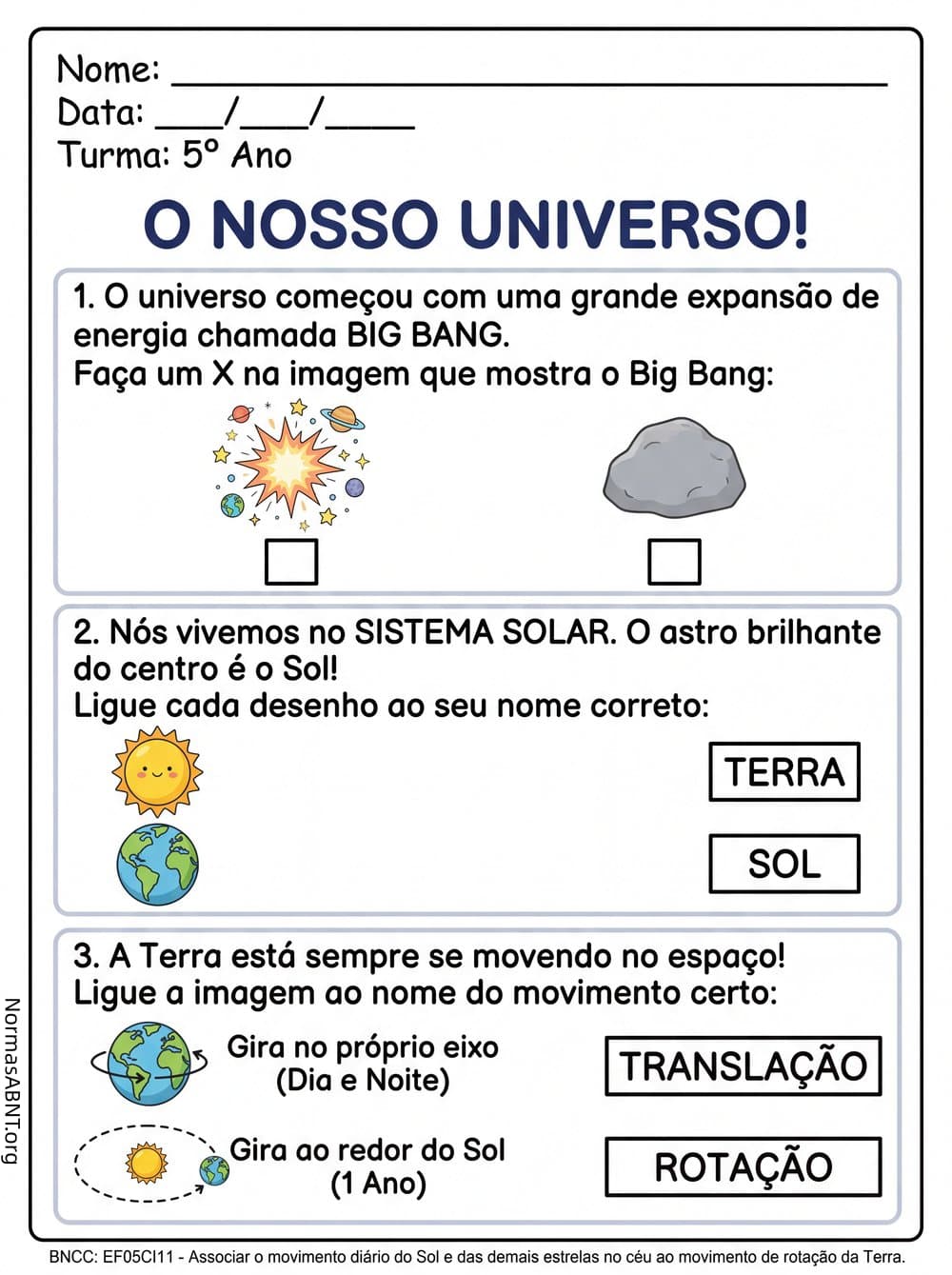 Esta é uma atividade para ciência do 5º ano do Ensino fundamental, conhecer o nosso universo, terra, sol, como se mover no espaço. Resolva as questões!