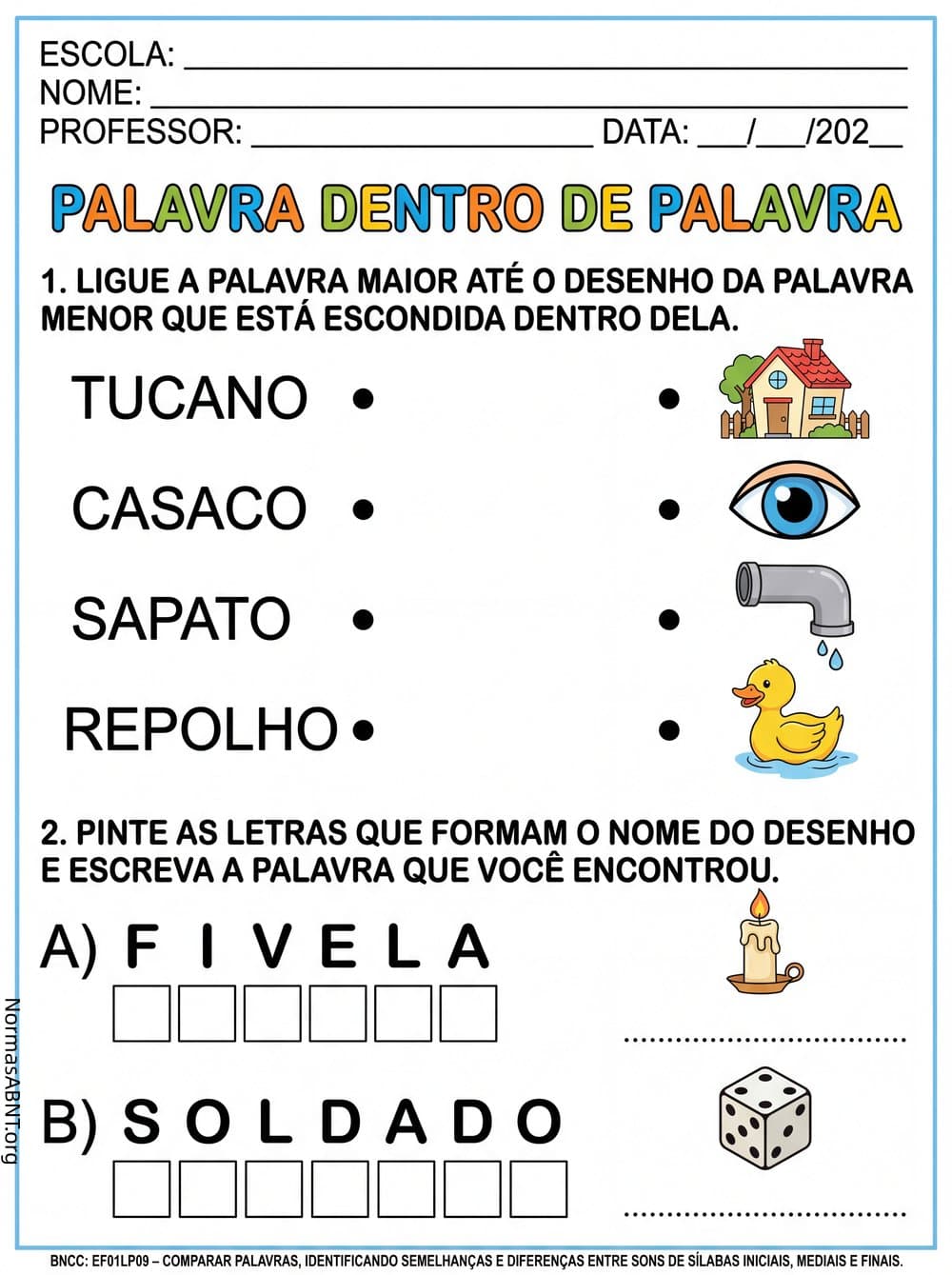 Esta folha de atividade é para língua portuguesa do 1º ano do ensino fundamental, sobre palavra dentro de palavra.