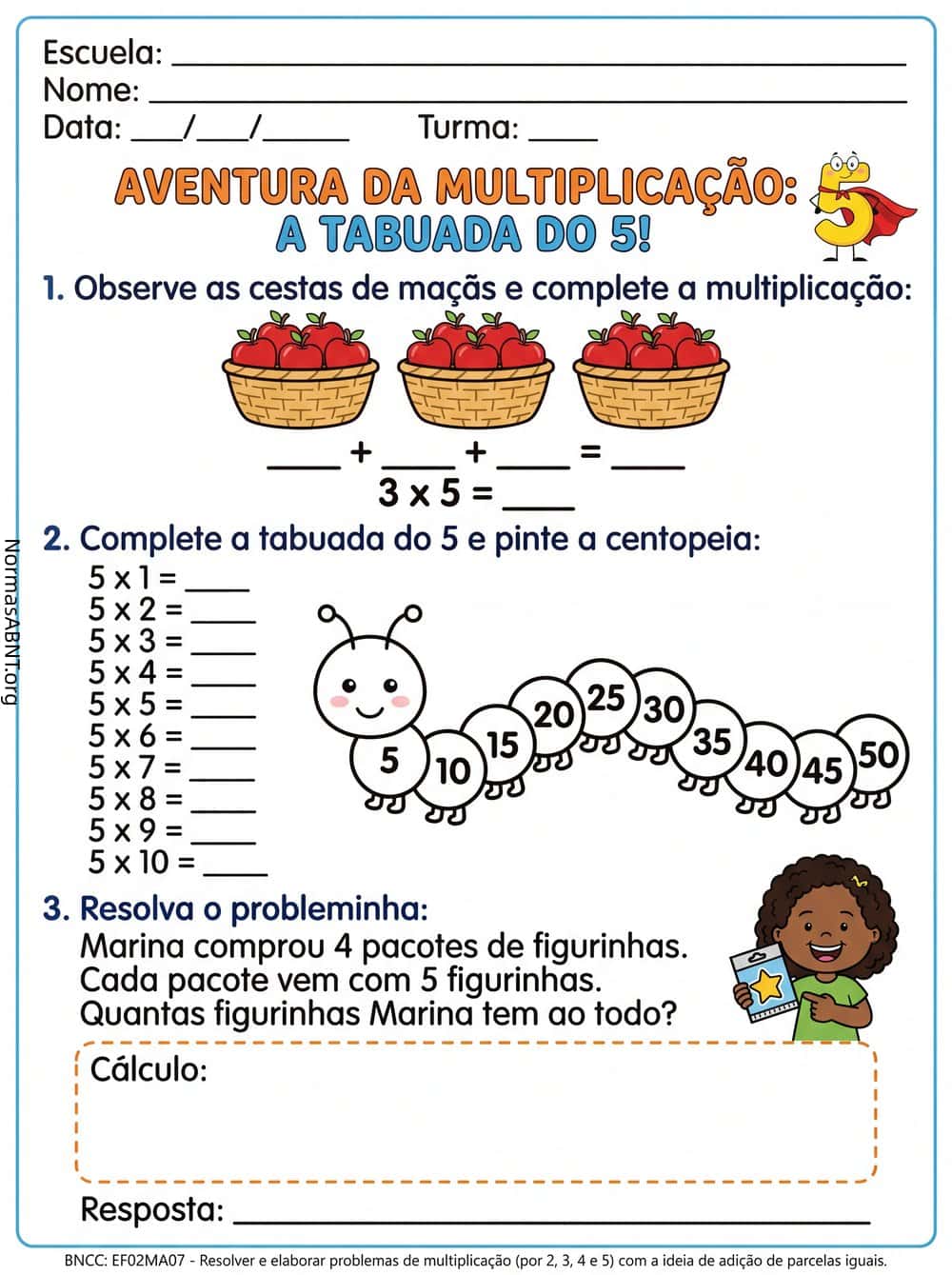 Atividade de multiplicação: Tabuada do 5, matemática para 2-3 ano do ensino fundamental. Baixa essa folha e resolva as questões.