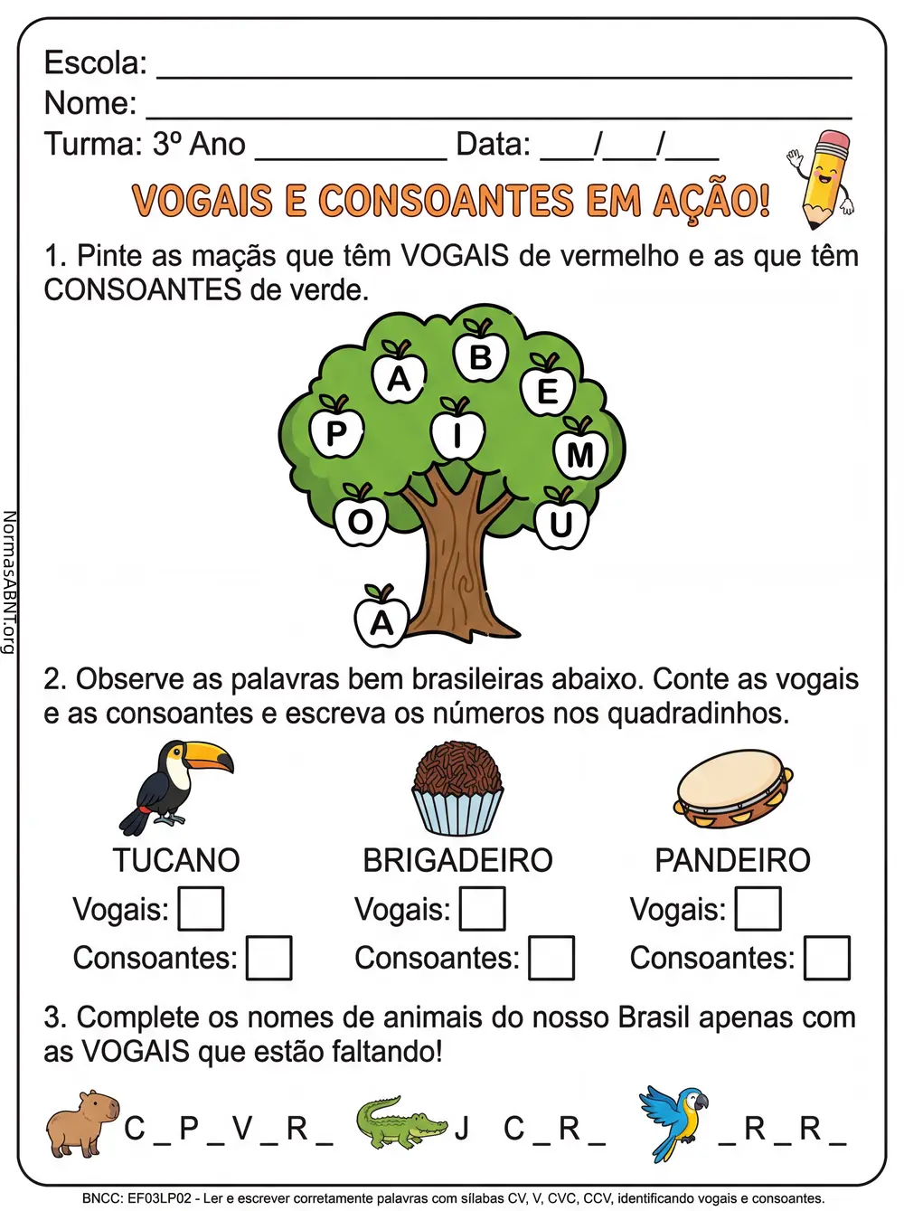 Folha de atividade sobre vogais e consoantes para 3º ano Ensino fundamental, baixar e imprimir grátis.