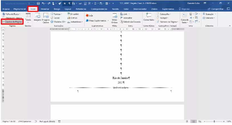 Após, avaliar a posição dos elementos da capa, vamos a ferramenta “Quebra de Página”, use essa função próximo as últimas linhas da página, esse recurso evitará que a capa perca sua formatação. Para utilizá-la, clique em “inserir”, logo após, “Quebra de Página”.