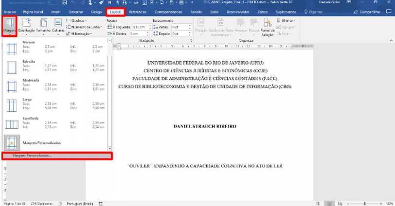 Assim sendo, para deixar seu Microsoft Word com esta formatação, vá até “Layout” em seguida clique em “Margens”. Feito isso, selecione a opção “Margens Personalizadas”, perceberá que ao selecionar esta opção, aparecerá uma tela.