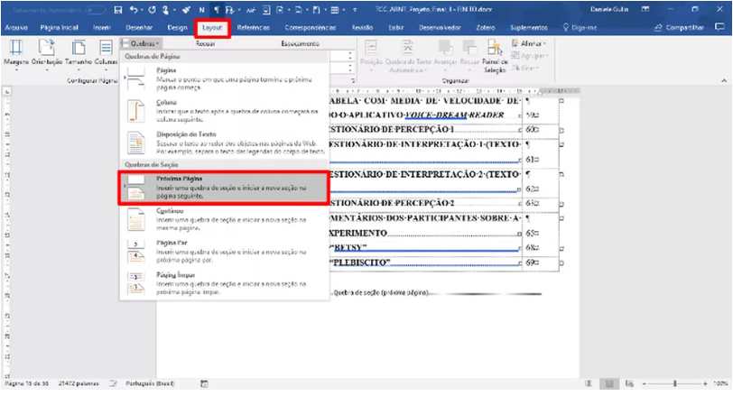 Para realizar este tipo de numeração no seu TCC, insira a Quebra de Seção, antes mesmo de começar a parte textual. Logo, vá até a aba “Layout”, clique em “Quebra de Seção” e em seguida escolha a opção “Próxima Página”.