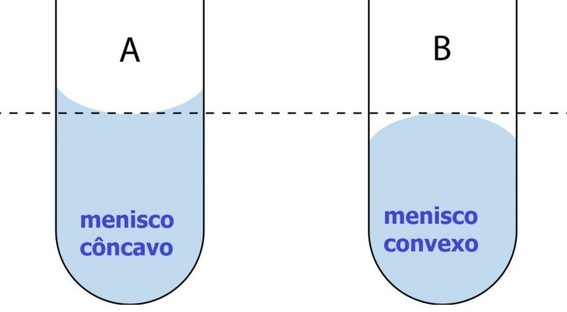 Como esta imagem mostra, um menisco pode ser côncavo ou convexo. Tudo depende se as moléculas do líquido são mais atraídas pelo material externo ou por elas mesmas.