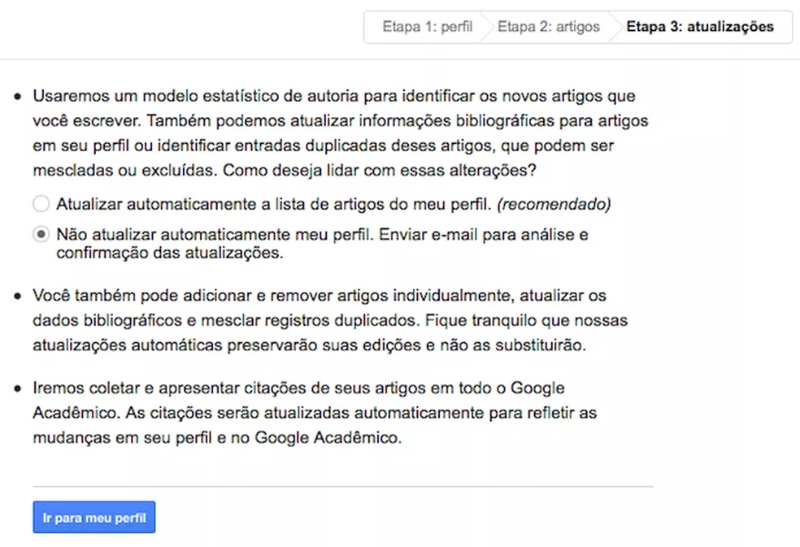 Caso deseje que novos artigos sejam adicionados em seu nome de maneira automática, basta selecionar a opção “atualização automática” ou se preferir clique em “enviar e-mail para análise”. Dessa forma, você será notificado por e-mail quando o Google Acadêmico encontrar novos trabalhos científicos de sua autoria, e assim poderá analisá-los e decidir se farão parte do seu perfil.