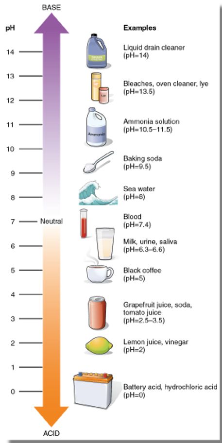 Como este diagrama mostra, o pH varia de 0 a 14, sendo 7 neutro. pHs inferiores a 7 são ácidos, enquanto pHs superiores a 7 são alcalinos (básicos). A precipitação normal tem um pH de cerca de 5,6 – ligeiramente ácido devido ao gás dióxido de carbono da atmosfera. Você pode ver que a chuva ácida pode ser muito ácida e pode afetar o meio ambiente de forma negativa.