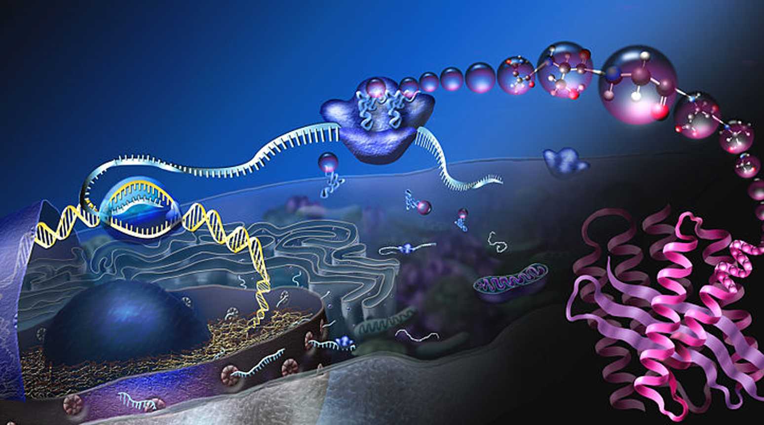 A síntese de proteínas é a criação de proteínas. Nos sistemas biológicos, ela é realizada dentro da célula. Em procariotos, ocorre no citoplasma. Em eucariotos, inicialmente ocorre no núcleo para criar um transcrito (mRNA) da região codificadora do DNA. O transcrito deixa o núcleo e alcança os ribossomos para tradução em uma molécula de proteína com uma sequência específica de aminoácidos.